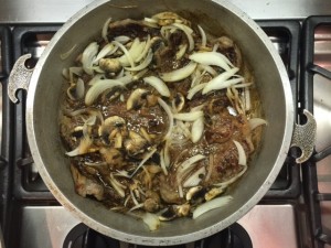 • Turn steaks over add salt and pepper (to taste); add onions, mushrooms, and butter.